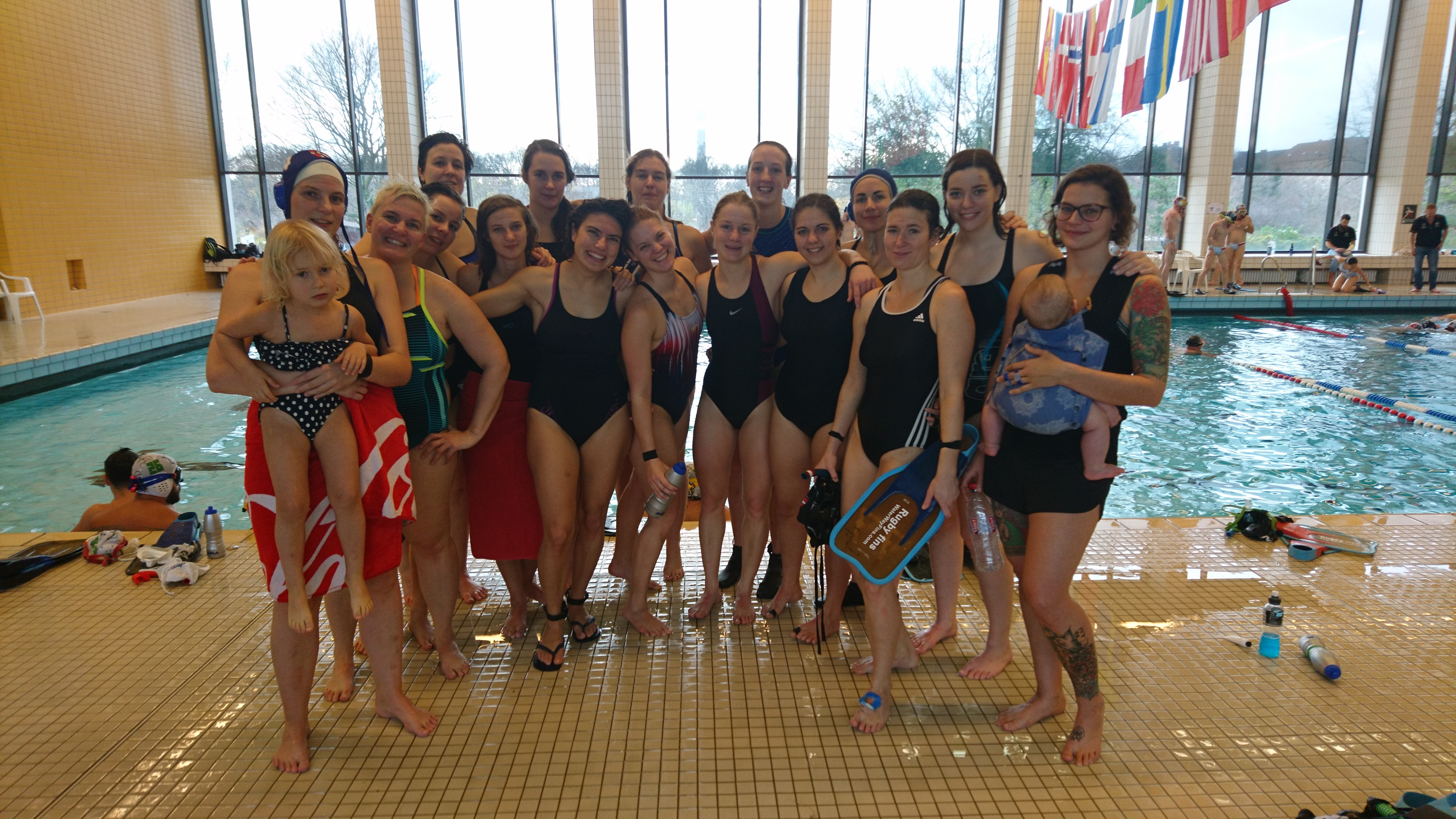 Samstagabend folgte noch das Match gegen die Perth Raiders, ein eher unerfahrenes Team aus Australien. Die Aufstellung erneut durch Krankheiten beeinträchtigt ging man dennoch mit dem vollen Vertrauen ins Spiel, diesmal zu siegen. Das Spiel begann auf Augenhöhe, die Österreicherinnen kamen ebenso zu Konterchancen und Angriffsaktionen, wie ‚the women von down under‘. Doch verwandelt wurden diese zunächst nur von den Raiders, welche früh in der ersten Halbzeit zwei Tore erzielen konnten. Ab diesem Moment begann die Aufholjagd des UWRC, als sichtlich der Druck der Wienerinnen erhöht wurde und man auf den Ausgleich presste. Ein Ruck ging durchs Team, die Körpersprache strahlte Trotz und Entschlossenheit aus. Mit steigenden Zweikampfquoten und vermehrten Kontern erzwang man kurz vor der Pause noch den so wichtigen Anschlusstreffer, Daniela N. traf zum 1:2. Die zweite Hälfte wurde intensiv geführt, doch Perth drückte nicht mit letzter Konsequenz auf die Entscheidung. Chancen vergingen, Minuten verstrichen. Erst 20 Sekunden vor dem Schluss fiel der erlösende Ausgleichstreffer. Sabine F. verwandelte zum 2:2 und der UWRC erzwang ein Penaltyschießen. Als erste Verteidigerin für den UWRC trat Karin E. an. Sie hielt die Angreiferin lange weg, doch kurz vor Ablauf der Zeit fand diese dennoch eine Lücke und verwandelte. Zum Ausgleich ging Julia B. an den Start. Sie hatte den Ball schon halb unter dem Ring, doch irgendwie gelang es der Torfrau, die bereits seitlich vom Deckel geschoben war, mit den Fingern dazwischen zu kommen. Nach kurzer Rangelei um den freigewordenen Ball konnte sie ihn sicher zur Oberfläche bringen. Damit ging die Partie nach dem ersten Strafwurd mit 2:3 verloren. Ein bitteres Ende, da man für die starke Aufholjagt nicht wirklich belohnt wurde.