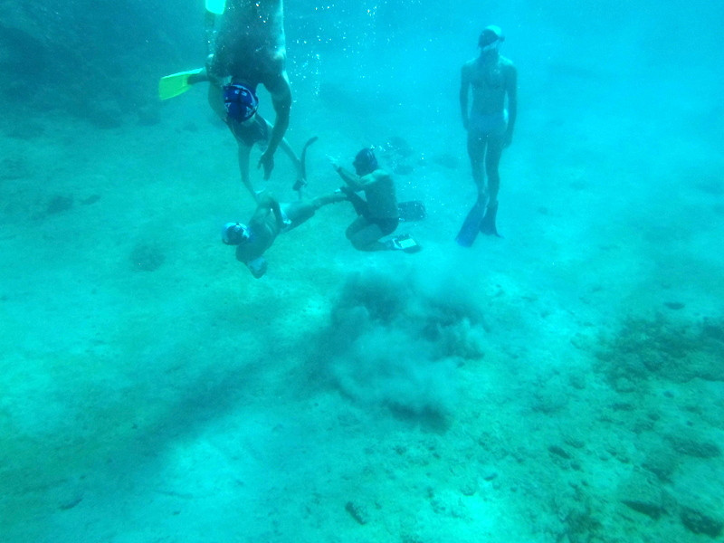 Das für sich alleine wäre ja schon nicht schlecht aber noch besser sind diese Dinge wenn man sie mit Unterwasserrugby verbinden kann. Dazu hatte der Autor dieser Zeilen im September dieses Jahres in Athen die Gelegenheit. Diese erlebenswerte Stadt ist seit einiger Zeit um eine Attraktion reicher, nämlich um das Unterwasserrugbyteam Fysalis [1] das auch schon den diesjährigen Steirischen Panther beehrte. Einen Tag vor der Abreise aus einem sehr erholsamen Urlaub durfte ich an einer Trainingseinheit des Teams teilnehmen. Da am 21. September (noch) keine unterwasserrugbytauglichen Schwimmbäder in Athen verfügbar waren, wurden die Körbe kurzerhand in der Bucht von Vouliagmeni [2] im Meer versenkt und ein Spielfeld mittels Bojen abgesteckt. Dadurch gestaltet sich das Spielerlebnis dann natürlich etwas anders als man das im Schwimmbecken gewohnt ist. Durch das Gefälle des Meeresbodens war ein Korb in einer Tiefe von ca. 5m, der andere auf ca. 6.3m angebracht wodurch zur Halbzeit des Trainingsspiels ein Seitenwechsel angesagt war. Die Sicht im kristallklaren Wasser war hervorragend, solange sich die Aktionen in mittlerer Tiefe abspielten. Durch die intensive Sonneneinstrahlung wurde nämlich die Orientierung in Richtung Wasseroberfläche erheblich erschwert. Auf der entgegengesetzen Seite des Spielfeldes, am Grund, tappte man hingegen des öfteren im Dunkeln wenn durch Rangeleien vor dem Korb Sand aufgewirbelt wurde und die Positionen des Korbs und der Spieler nur mehr schwer zu erkennen waren. Die Ballphysik war durch das umgebende Salzwasser natürlich auch leicht abweichend, allerdings hätte ich diesen Effekt weitaus schwerwiegender eingeschätzt als er tatsächlich war. Die Sinkgeschwindigkeit das Balls war nur unwesentlich langsamer als gewohnt. Abgesehen von den erwähnten Einschränkungen ist das Spiel im Meer auf jeden Fall ein besonderes Erlebnis. Besondere Freude machten während des Spiels zum Beispiel Fischschwärme die zeitweise bei der Verteidigung des Tors auszuhelfen versuchten :)