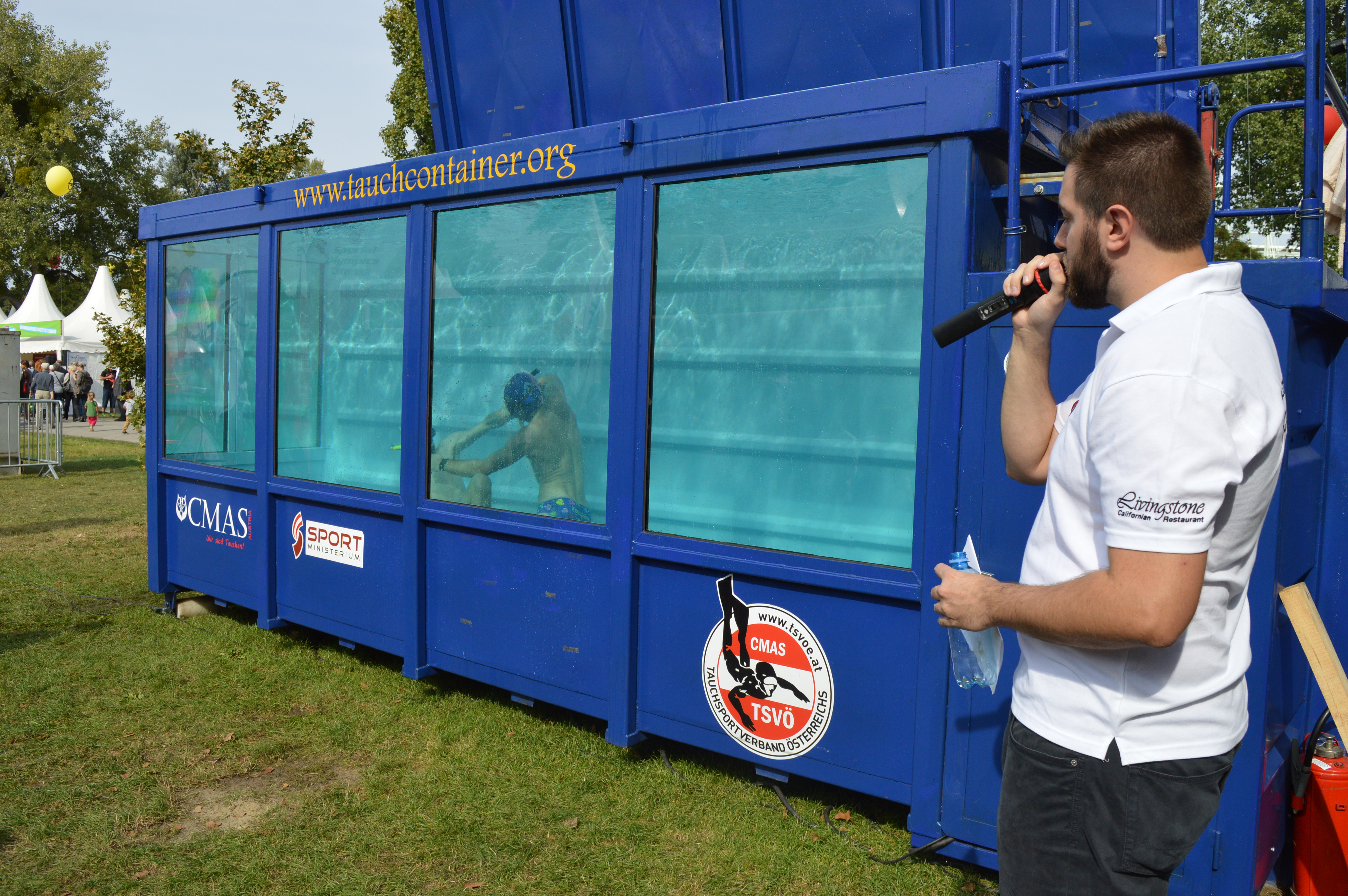 Zwischen den Vorführungen im Container waren zu jederzeit mehrere UWRC-SpielerInnen beim Infostand vertreten und erklärtem anhand eines Videos wie das Spiel in echt aussieht. Immer wieder schwärmten auch Zweierteams aus und lockten Besucher am ganzen Gelände zum "Fischtank".