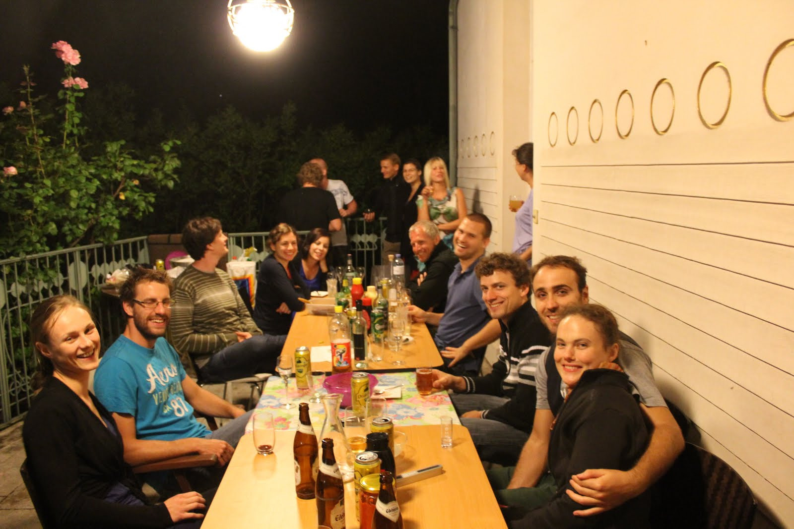 Nun konnte das Fest beginnen! Die Grillmeister (Andi, Uli, Frank ...) hatten alles soweit vorbereitet, sodass wir bald knuspriges Fleisch, leckeren Grillkäse, (Berner) Würstel und feinste Burger mit selbstgemachten Soßen (Dank an Marina) genießen durften. Andi und Thomas J. warfen all ihre Zehen (20 an der Zahl!) in ein göttlich knoblauchiges Tsatziki. Am besten kombiniert mit spanischem Riesenrosinenbrot!